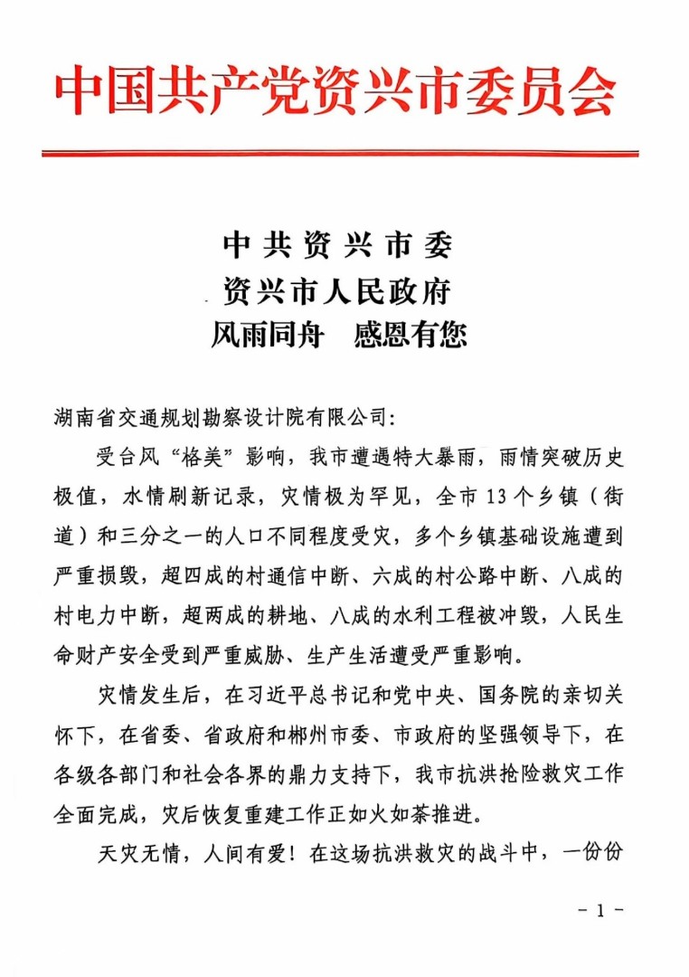 近日,中共資興市委、資興市人民政府發(fā)來感謝信,信中高度評價了湖南省交通規(guī)劃勘察設(shè)計院有限公司在馳援資興搶險救災(zāi)及災(zāi)后恢復(fù)重建工作中展現(xiàn)的擔(dān)當(dāng)精神和技術(shù)水平,對公司作出的積極貢獻表達(dá)了誠摯的感謝。信中指出,資興市此次遭遇災(zāi)情極為罕見,多地基礎(chǔ)設(shè)施遭到嚴(yán)重?fù)p毀、大范...