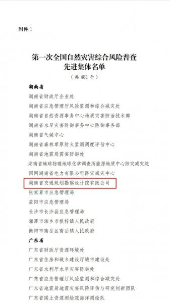 國務(wù)院表彰!湖南建投交通設(shè)計(jì)院榮獲“全國自然災(zāi)害綜合風(fēng)險(xiǎn)普查先進(jìn)集體”稱號(hào)